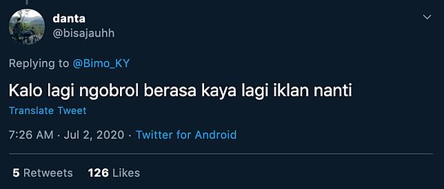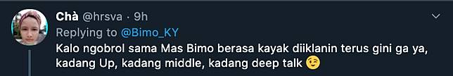 Sedangkan warganet yang lain berpendapat jika mengobrol dengan Bimo maka akan terasa seperti mendengar iklan.